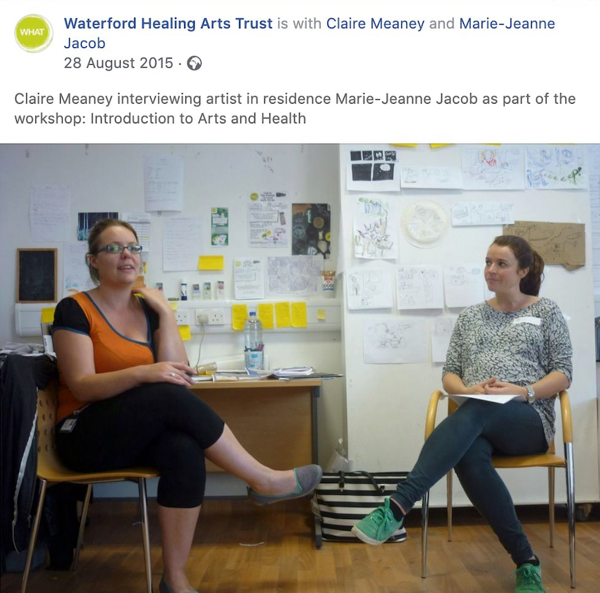 In 2015, MJ was the Artist in Residence at Waterford Healing Arts Trust (WHAT) in University Hospital Waterford. Her residency included engaging the patient population in the creative process, running individual and group workshops with the Child and Adolescent Mental Health Unit, and Chronic Pain Management.